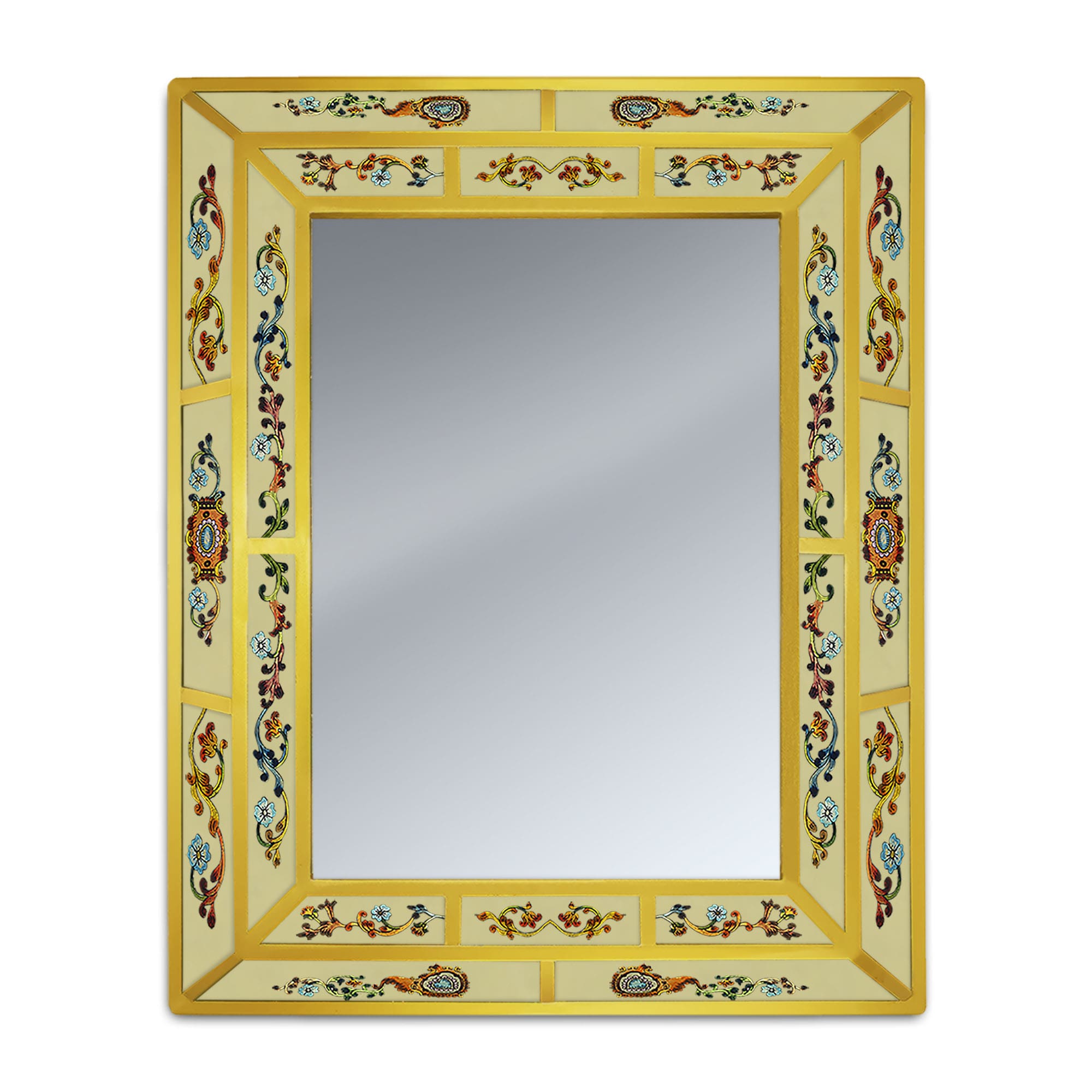 This wall mirror showcases a convex-shaped frame crafted from intricately decorated glass pieces. The églomisé technique and reverse painting on glass add timeless elegance and sophistication. A 3D-printed structure firmly unites the glass elements with a robust wood base. At its center, a 3mm-thick mirror delivers flawless, distortion-free reflections, blending beauty with practicality.